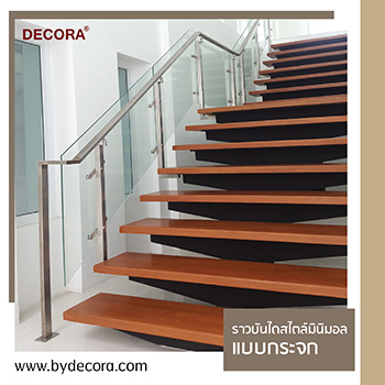 ราวบันไดสไตล์มินิมอลแบบกระจก กำลังได้รับความนิยมเป็นอย่างมาก เนื่องจากติดตั้งออกมาแล้วทำให้พื้นที่บ้านดูกว้าง โปร่ง สบายตาเพิ่มมากขึ้นจากเดิมมากค่ะ วัสดุทำจากสเตนเลสเกรด 304 ทั้งชิ้น ทำให้รับน้ำหนักของกระจกได้เป็นอย่างดี มาคู่กับกระจกนิรภัยเทมเปอร์หนา 10 มม. เพราะความปลอดภัยในการใช้งานคือหัวใจของ DECORA ที่เราตั้งใจมอบให้คุณลูกค้าคนสำคัญ